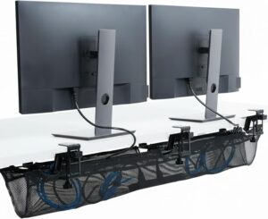 The work desk is 5 feet wide. I also have a non-work desk where most of my nerd stuff sits, and it is 8 feet wide. The power strip for that area is already bolted to the underside of that desk and has been for some time, but the cables are a-danglin’, so I have ordered a cable tray for this desk as well. I wanted a longer one so I ended up ordering a 55″ version; it’s a different design than the one I installed the other night but I think it’ll work: