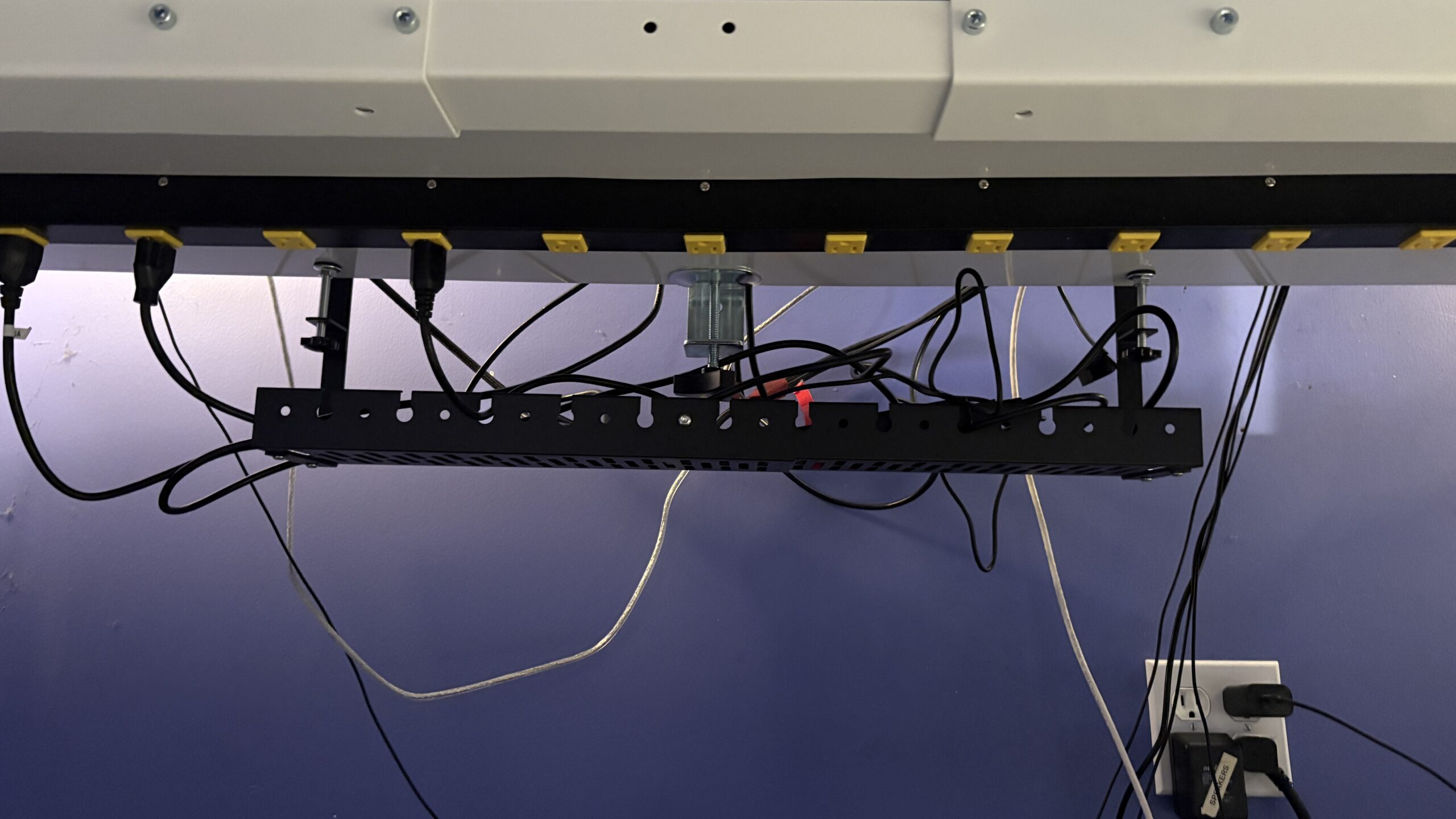 As you can see from the attached image, I successfully installed a cable tray onto my work desk, and got the power strip bolted to the bottom of the desk so it’s off the floor. This had the added benefit of allowing me to plug it back into the UPS instead of directly into the wall since, prior to it’s relocation, it wouldn’t reach the UPS.
